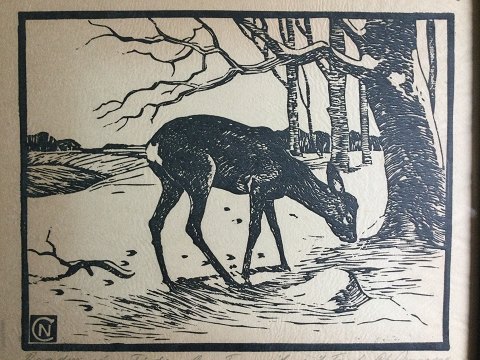 Christian Nygaard (20 årh): Rådyr søger føde. Træsnit på papir. Sign.: CN i trykket og Chr. Nygaard (bly). Eget tryk Indrammet 24x29