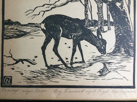 Christian Nygaard (20 årh): Rådyr søger føde. Træsnit på papir. Sign.: CN i trykket og Chr. Nygaard (bly). Eget tryk Indrammet 24x29