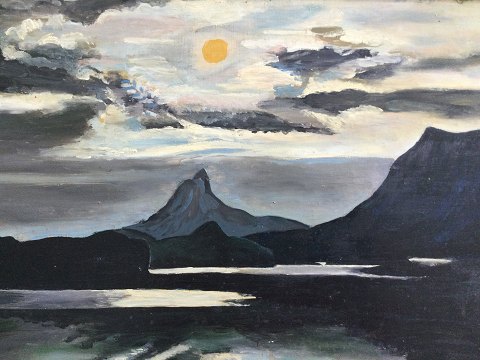Ole Jonsrud (1875-1955): Solnedgang bag bjerge 1951. Olie på plade. Sign.: O.J. 1951. 43x60 (52x68)