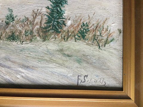 F. Schultz (19 årh): Vinterparti med gårde. Olie på lærred. Sign.: F. Schultz Nyere ramme. 25x29 (32x36)