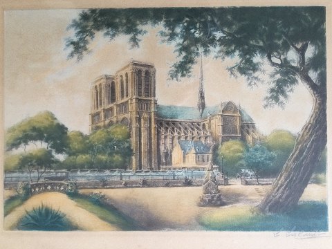 Leon LaCault (født 1866): Nortre Dame i Paris. Farveradering på papir. Sign.: L. Lacault 24x34 (34x44)