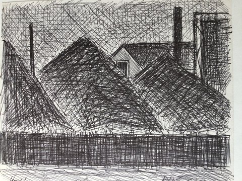 Peder Brøndum Sørensen (1931-2001): Kulbunker ved Gasværk 1964. Tusch på papir. Sign.: PBS 64. 17x20 (19x25)
