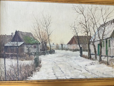 Hans F. Østed (født 1918): Vinterparti fra Enegårde ved Præstø 1945. Olie på lærred. Sign.: Hans F. Østed 1945 Bagpå blindramme - Enegaarde, Sne 33x50 (48x65)