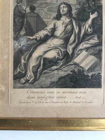 Étienne Picart (1631-1721): Motiv fra Salmernes Bog 31 "Conversus sun in Ærumna mea dum configitur spina" "Tolle Lege" Kobberstik på papir. Plademål 21x12 Indrammet 27x18