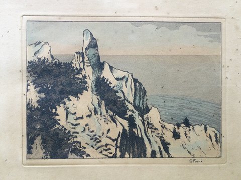 Søren Frank (1902-76): Møns Klint, Sommespiret. Farveradering på papir. Sign.: S. Frank 13x17 trykfladen 22x25 Indrammet nr. 135