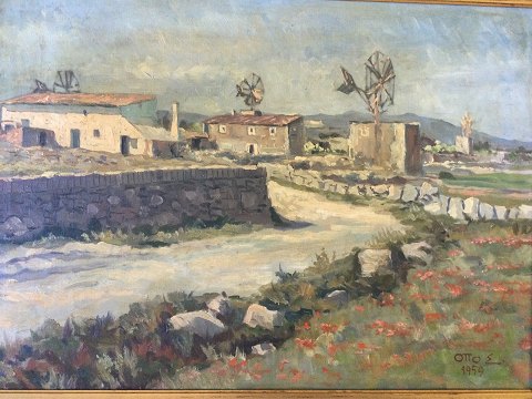Otto Eilertsen (1908-72): Sydlandsk landskab med klippegrund og vindmøller 1959. Olie på lærred. Sign.: Otto E. 1959 47x66 (57x76)