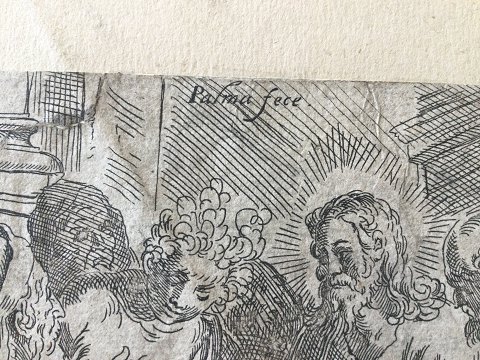 Jacopo Palma den Yngre (1544-1628): Kristus og Kvinden taget i ægteskabsbrud 1611. Kobberstik på papir monteret på pap. Sign.: Palma Fec Uden ramme Bladet måler 11x16½ (15x20) 27121
