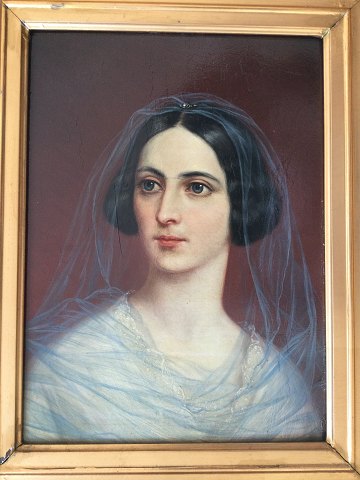 Portræt af ung, sorthåret kvinde med florlet slør monteret med diamantnål i håret.