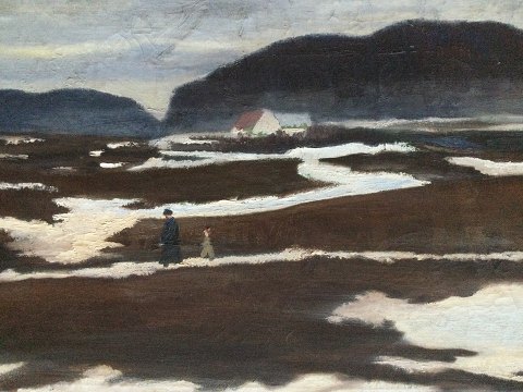 Johannes Dührkop (1903-85): Vinterparti fra Asminderød 1943. Olie på lærred. Sign.: JD (monogram) - 43. Bagpå rester af udstillingsmærkat nr. 4. Lækker guldramme. 55x69 (64x79)