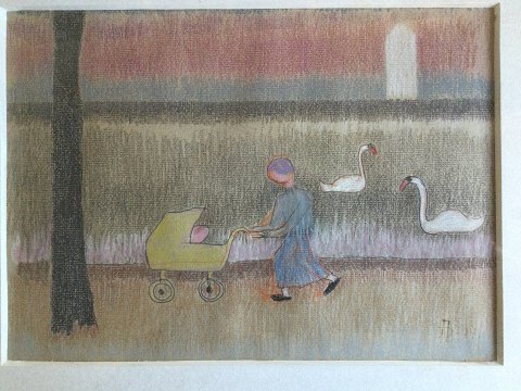 Johannes Dührkop (1903-85): Pige med barnevogn og 2 svaner 1974. Oliekridt pċ papir. Sign.: JD (monogram) - 74. 22x30 (33x43)