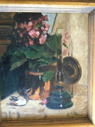 Gunner Bundgaard (1920-2005): Opstilling på bord med petroleumslampe, fugl og blomst. Olie på plade. Sign.: G. Bundgaard 30x25 (39x34) Gunnar Bundgaard