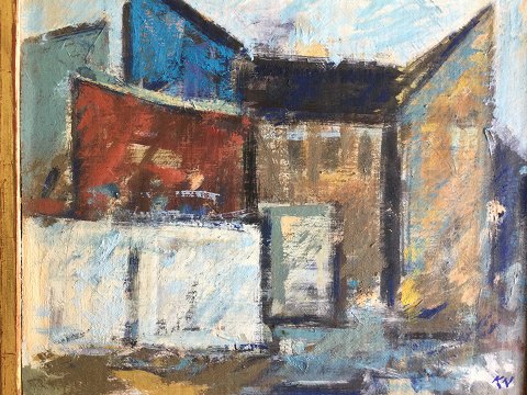 Kurt Nedergaard (født 1945): Gavle - den indre by 1987. Olie på lærred monteret på plade. Sign.: KN Bagpå - KN samt Kurt Nedergaard Bategnet bagpå - Gavle - Den indre by 1987. 21x25 (23x27)