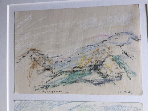 Ubekendt kunstner (20 årh): 4 bjerglandskaber i samme ramme. Oliekridt på papir. Indrammet i samme ramme uden glas. Betegnet "I Bjergene" nr. I, II, III og IV. Sign.: ICRL Indrammet 46x61 49121