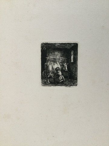 Johannes Vilhelm Zillen (1824-70): Pige malker ko 1858. Radering på papir. Sign.: W.Z. 1858(i trykket) Uden ramme. Bladet måler 36x27 (trykfladen 7½x6) 21622