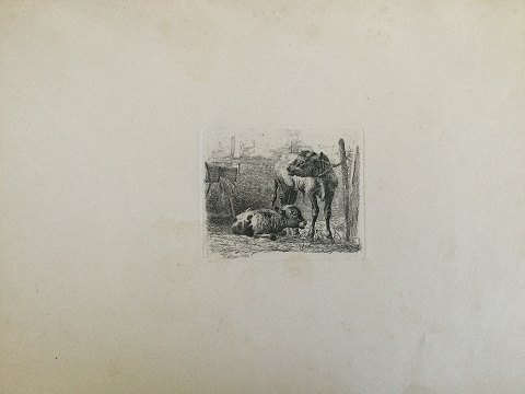 Johannes Vilhelm Zillen (1824-70): To kalve i stald 1858. Radering på papir. Sign.: W. Zillen 1858 (i trykket) Uden ramme. Bladet måler 28x36 (trykfladen 8x9½) 21622