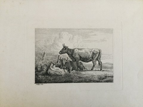 Johannes Vilhelm Zillen (1824-70): Køer ved et gærde 1859. Radering på papir. Sign.: W. Zillen 1859 (i trykket) Uden ramme. Bladet måler 27x36 (trykfladen 16x22) 21622