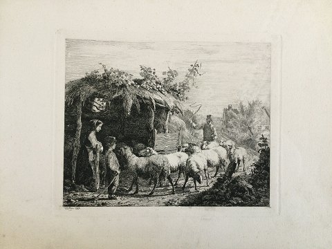 Johannes Vilhelm Zillen (1824-70): Får og mand med lam 1859. Stregætsning på papir. Sign.: W. Zillen 1864 (i trykket) Uden ramme. Bladet måler 27x36 (trykfladen 18½x23) 21622