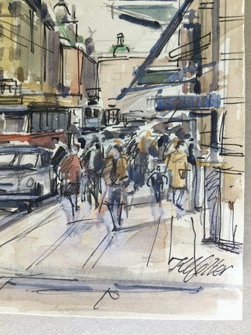 Kai Molter (1903-77): Hotell Astoria, Vasagatan 10 i Stockholm. Tusch og akvarel på papir monteret på brunt papir. Sign.: K. Molter Indrammet i sort plastic ramme. 18x13 (26x21) 23322