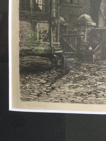Peter Tom-Petersen (1861-1926): Apotekets Gård i Ribe 1903 Radering på papir. Sign.: Monogram 1903 Indrammet med nyt syrefrit passepartout. 19½x23 (40x36) 46521