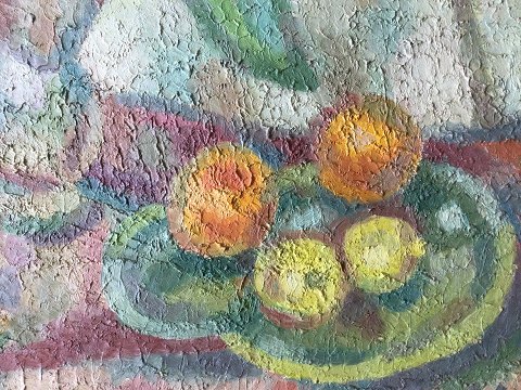 Opstilling med blomsterbuket og frugtfad på bord 1950.