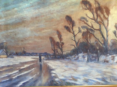 Axel Tankmar (1880-1960): Vinterlandskab med personer på vej Olie på lærred. Lille hul i lærred (se foto) Sign.: A. Tankmar 61x94 (76x109) 35604