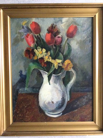 Ingeborg Bentine Debois (1897-1970): Kande med tulipaner, påskeliljer m.fl. 1939. Olie på lærred. Sign.: I.B. Debois Bagpå label - "1939" 63x51 (74x61)