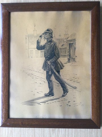 Peter Tom-Petersen (1861-1926): "En Brandchef 1897" Tusch på papir. Sign.: Tom P. 97. Betegnet - "En Brandchef". Bagpå betegnet - Brandmajor Hunt i Faaborg 47x37 (53x43)