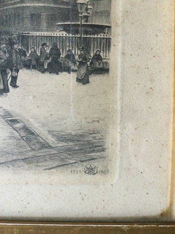 Peter Tom-Petersen (1861-1926): Gammel Torv i København med Vor Frue Kirkes tårn i baggrunden, vinter 1902. Radering på papir. Sign.: Monogram 1884-1902 Lidt plettet 27x22 (34x29)