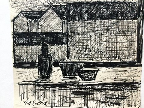 Peder Brøndum Sørensen (1931-2001): Vindueskarm med flaske og skåle 1958. Tusch på papir monteret på større ark 21x30. Sign.: P.B.S. 1958. Uden ramme. 17x20