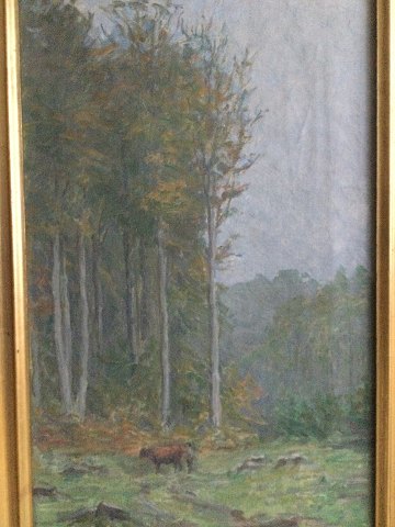 Brita Barnekow (1868-1936): Skovparti med dreng og ko i lysning 1919. Olie på lærred. Sign.: Monogam BB 1919. Lækker samtidig ramme. 53x32 (61x40)