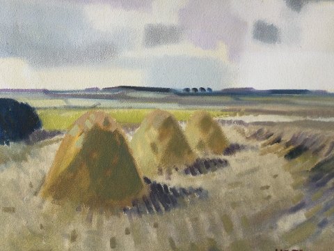 Knud Horup (1926-73): Høstparti med høstakke. Olie på lærred. Sign.: Horup Uden ramme 60x70