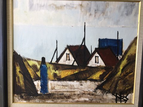 Peder Brøndum Sørensen (1931-2001): "Figur, Huse ved havet" 1976. Olie på lærred. Sign.: PBS. Bagpå - PBS 76 Peder Brøndum Sørensen 1976 - Figur, Huse ved Havet. 51x61 (65x75) 15023
