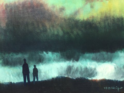 Knud Horup (1926-73): Personer ved oprørt hav. Olie på lærred. Sign.: Horup 60x70 (72x82) 16923