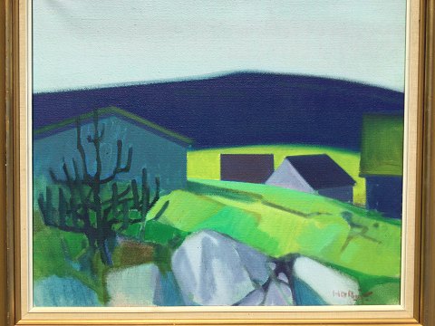 Grønt og blåt regnskab med stendige og nøgent træ.