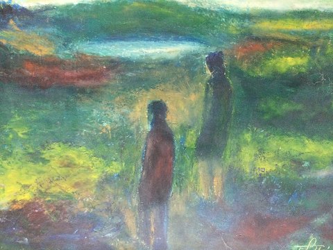 Folmer Støve (1918-2005): Personer i landskab. Olie på lærred. Sign.: F. Støve 70x80 (88x98)