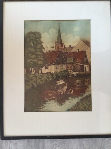 Otto Holm (20 årh): Parti fra Vejle med åen og Sankt Nicolai Kirke. Farveradering på papir. Sign.: Otto Holm i trykket. Betegnet - Vejle Aa: 33x24 (49x40) 36305