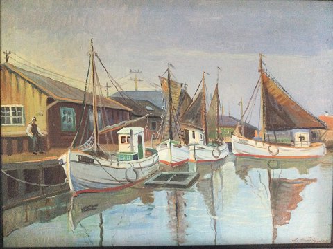Aksel Lundgreen (1908-89): Havneparti. Olie på lærred. Sign.: A. Lundgreen. Indrammet i moderne svæveramme. 65x86 (68x90) 19408