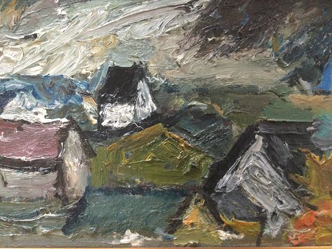 William Hansen (1908-91): Landskab med huse 1967. Olie på plade. Sign.: Monogram 67 32x52 (38x58) William Hansen var uddannet fra Teknisk Skole i Odense 1924-26 ved A.C. Tersløse og Marlo Joensen.