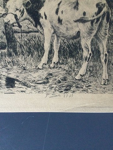 Poul Steffensen (1866-1923): 2 kvier ved gærde 1900, Radering på papir. Sign.: P. St. 1900 (I trykket) Uden ramme. Plade mål - 21x16 - arkets mål 22x18 25323