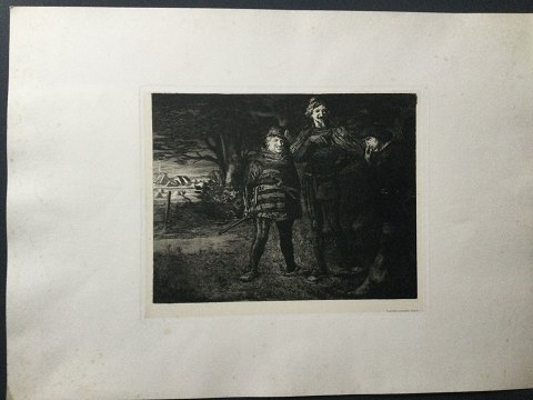 Hans Nicolaj Hansen (1853-1923): De Tre Skalke "Rådslagningen" 1897. Opus 13 Radering på papir. Usigneret. Tryk hos Max Kleinsorg DDRF 1897. Uden ramme Pladen måler - 22x27 Bladet måler - 37x51 25323