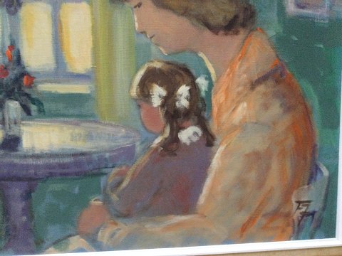 Finn Johansen (1942-2006): Mor og barn ved vindue. Olie på lærred. Sign.: FJ 50x60 (64x74) 37104 Finn Johansen var elev af Sven Dalsgaard, Randers 1968-72.