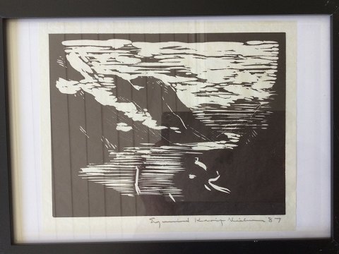 Eyvind Karup Nielsen (1920-88): Landskab 1987. Træsnit på japanpapir. Sign.: Eyvind Karup Nielsen 87. 19½ x 23½ (24x33) Har også et eksemplar uden ramme. 10624