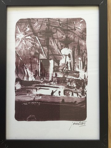 Johannes E. Møller (født 1953): Stykgodsskibet ankommer til havn 2001. Litografi på papir. Sign.: jem 2001 29x21 (33x24) har ét eksemplar på lager uden ramme. 10624
