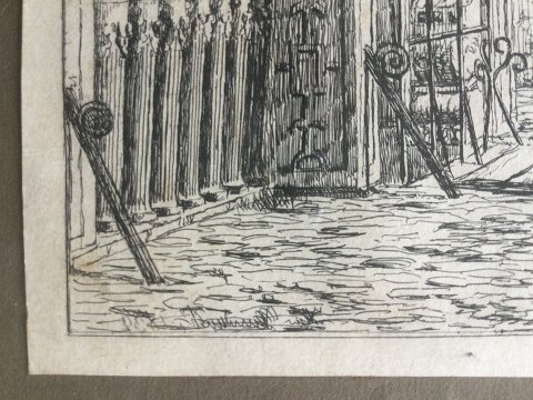 Thorald Læssøe (1816-78): Indkørselsporten på Vallø Slot 1839. Radering på papir. Sign.: Thorald Læssøe 1839 (Spejlvendt i trykket) 18x21 (25x28)