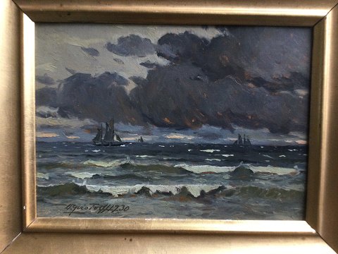 Victor Qvistorff (1882-1953): Sejlskibe ud for kysten ved Hornbæk 1930. Olie på plade. Sign.: V. Qvistorff 1930. 16x22 (22x28) 21224