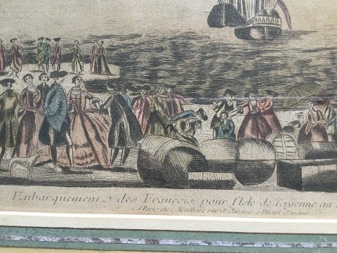 Jacques Chereau (1688-1776): "Embarquement des Francais pour...." Håndkoloreret Kobberstik på papir. Indrammet i smuk "sølv" ramme hos Hugo Kerr i Hamburg. 27x43 (37x52) 23824