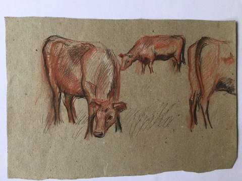 Torkil Norél (1922-2009): Skitser - Røde køer. Kul/bly/farvekridt på papir. Sign.: usigneret Uden ramme 21x31 5924
