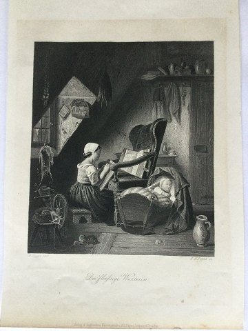 Albert Henry Payne (1812-1902): Den hårdtarbejdende barneplejerske 1855. Efter maleri af August Siegert (1820-83). Stålstik på papir. Sign.: A.H. Payne sc / A. Siegert pinx Uden ramme Arket måler 24½ x17½