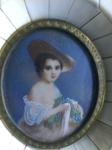 Ubekendt miniature maler (19 årh): Portræt af smuk ung kvinde med hat og frugtkurv. Gouache på ben. Indrammet i smuk benramme. Mål: 5x4 (10 x 8½)