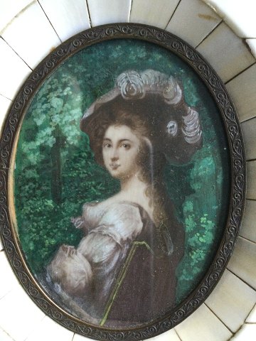 Portræt af ung dame med fjerprydet hat i havelandskab.